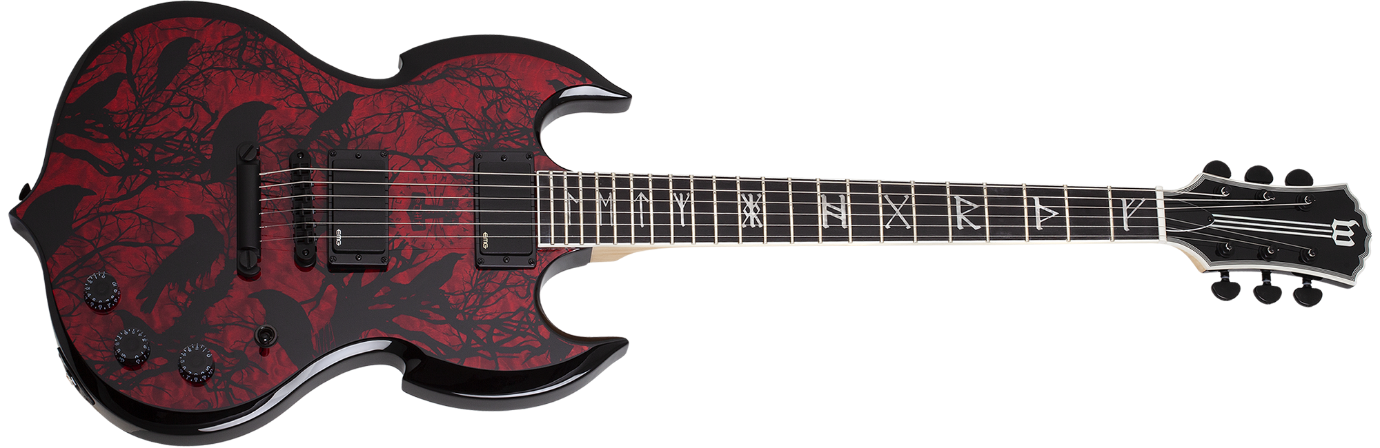 They've also released a couple collaborations with Zack Wylde, mostly known for playing guitar for Ozzy Osborn, and more recently joining Pantera in 2022, one guitar being titled Barbarian and the other Berzerker. These guitars both feature unique body shapes, custom fret in-lays, and a red and black printed front. The Barbarian features a crow and trees image, while the Berzerker features skulls. All of which have string through bodies and bridges.